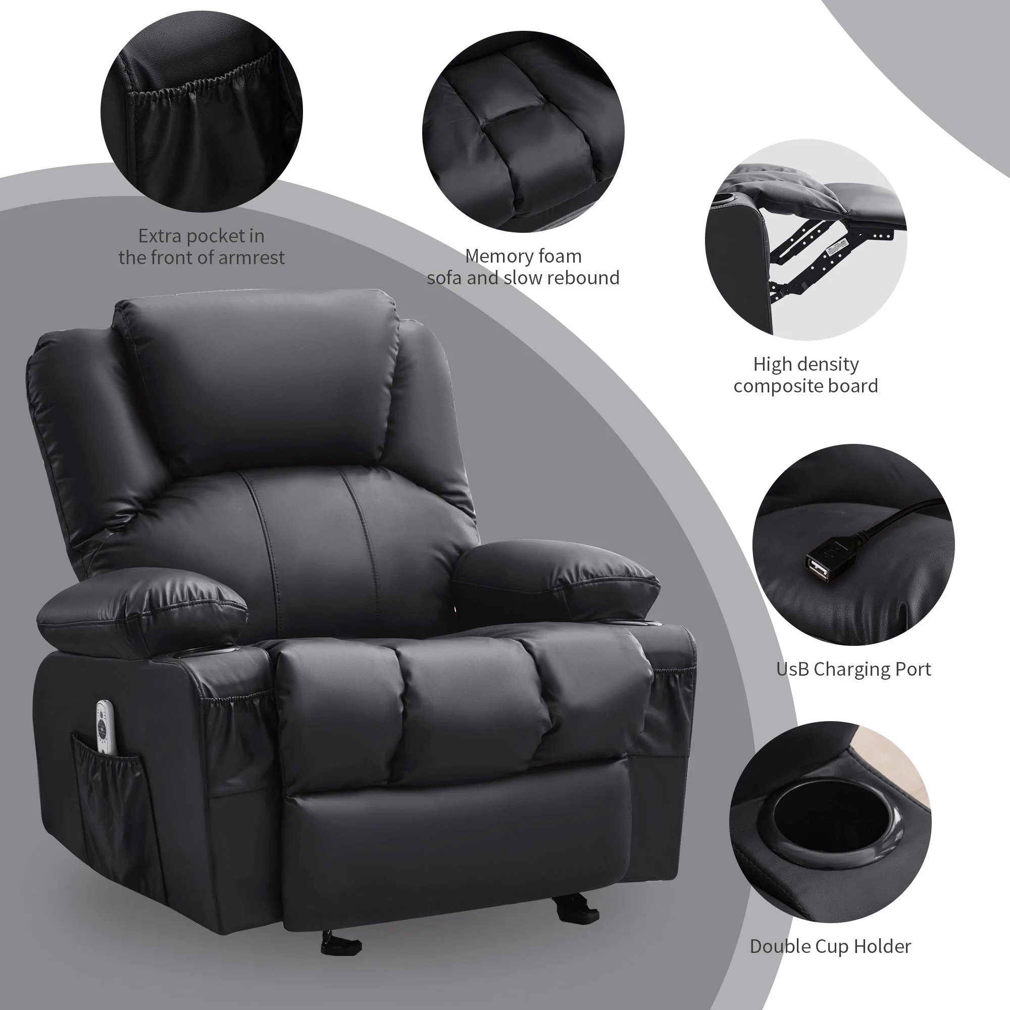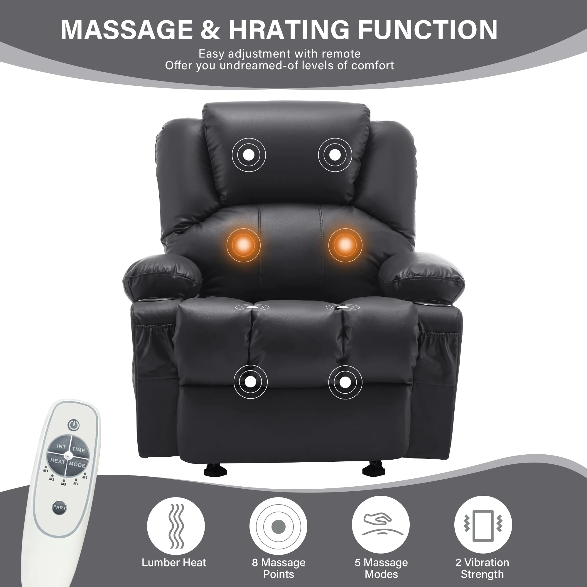 - Therapeutic Comfort: Features heat therapy and an 8-point massage function for full-body relaxation, complemented by thick seating, backrest, and extra lumbar support for enhanced comfort.